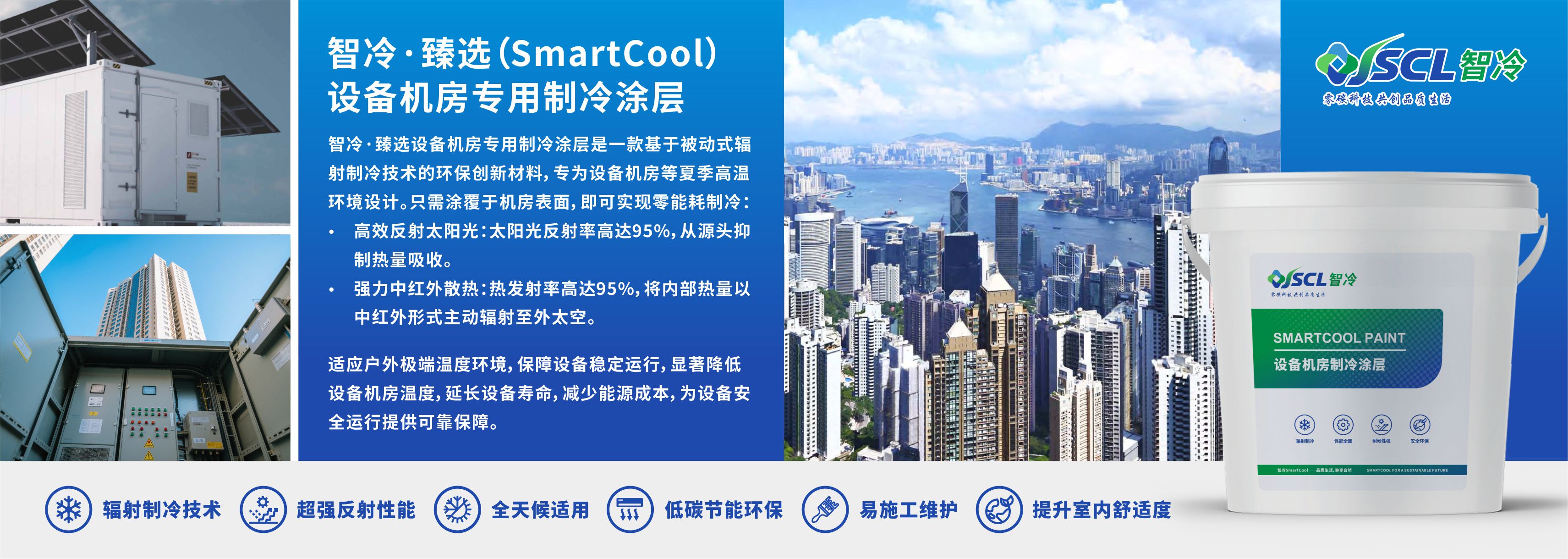 智冷·臻选(SmartCool)设备机房专用制冷涂层采用被动式辐射制冷技术,仅需涂覆于设备机房表面,无需电源与制冷剂,即可实现高达95%的太阳光反射与中红外热辐射,从源头抑制吸热并主动散热。该方案零能耗运行,显著降低设备温度、延长寿命、减少能源成本,为设备机房提供绿色安全的控温新选择。