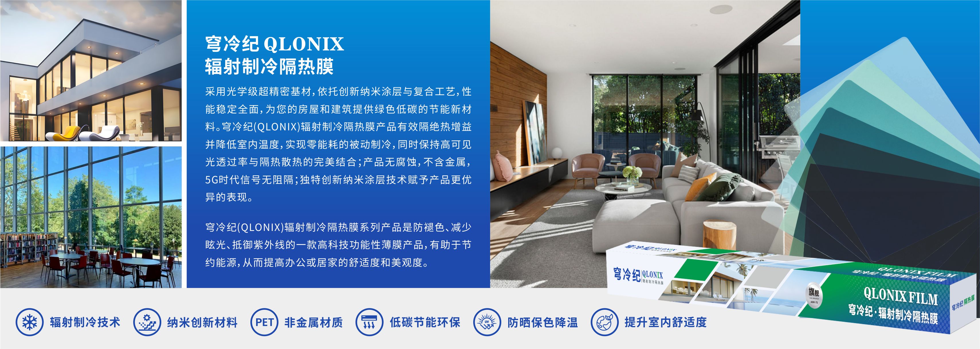 在能源危机与全球变暖的背景下,建筑能耗已成为碳排放的主要来源之一。穹冷纪 QLONIX品牌,依托国际前沿科技,创新推出被动辐射制冷解决方案。我们不是简单地阻挡热量,而是重新定义了建筑降温的方式——让建筑学会自己“散热”。穹冷纪 QLONIX 辐射制冷隔热膜采用光学级超精密基材,依托创新纳米涂层与涂布工艺,性能稳定全面,为您的房屋和建筑供绿色节能薄膜产品。穹冷纪·臻选建筑隔热膜产品有效降低太阳光热量吸收并促进热辐射发射,实现零能耗的被动制冷,高透光与隔热的完美结合;无腐蚀,产品不含金属;5G时代信号无阻隔;创新纳米涂层技术赋予了产品优异的性能。 穹冷纪 QLONIX辐射制冷隔热膜系列产品是防褪色、减少眩光、抵御紫外线的一款高科技功能性薄膜产品,有助于节约能源,从而提高家居的舒适度和美观度。